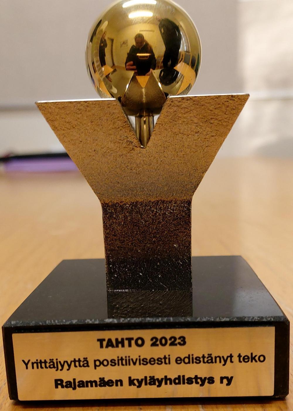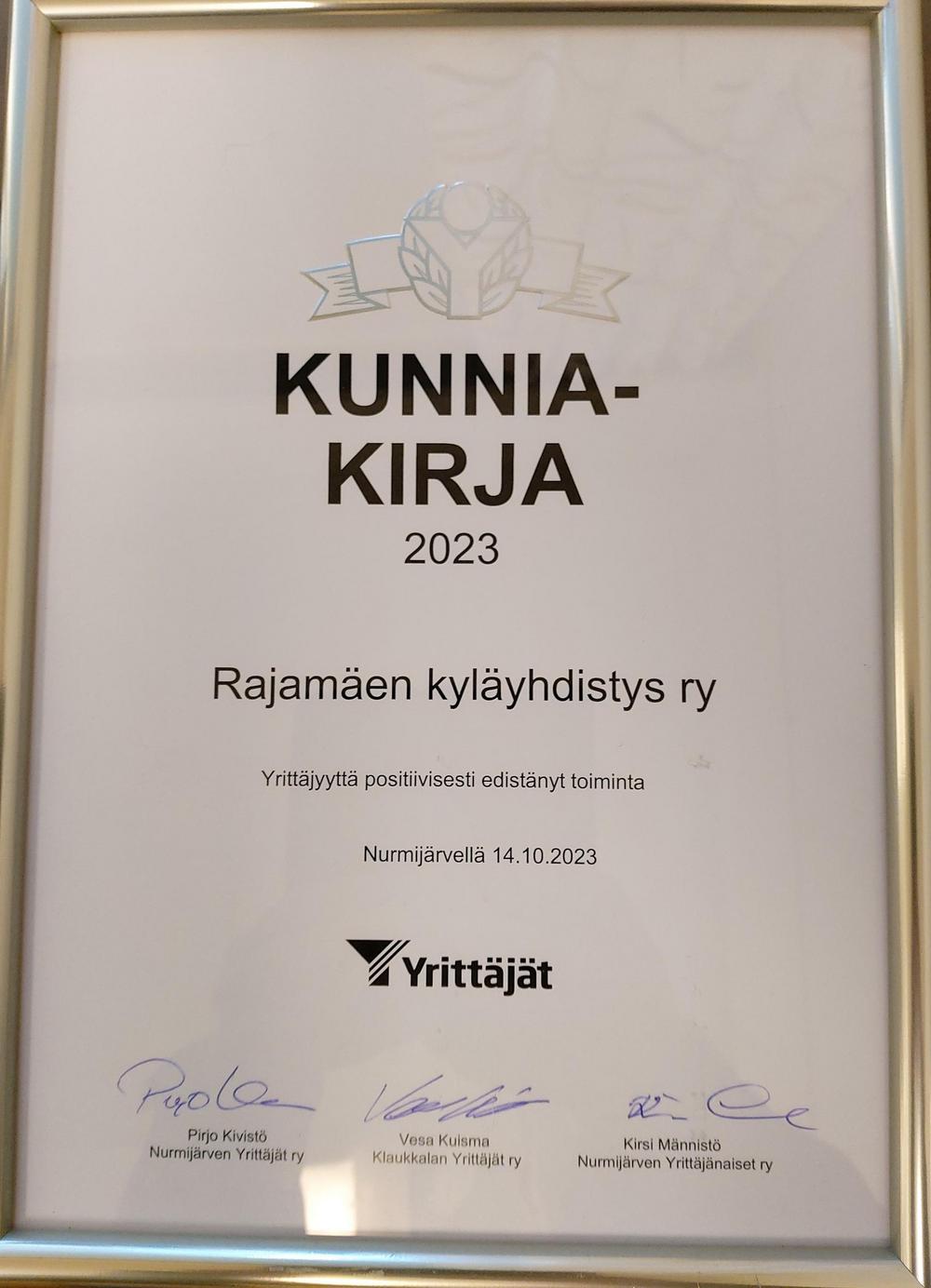 Palkinto ja kunniakirja luovutettiin yrittäjien juhlassa 14.10.2023. Tunnustus myönnettiin Rajamäen Kyläyhdistyksen ja rajamäkeläisten yrittäjien yhdessä rakentamasta joulunkalenterista joulukuulle 2023.
